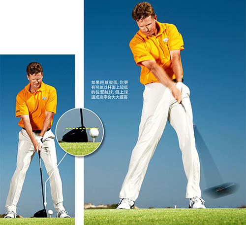为了使击球距离达到最大值,你总是把球架高,使得至少半个球高于杆头顶端。把球架高以后,如果你能做出完美击球,击球距离就能达到最大值。但把球架高加大了打偏的可能性,尤其是在未能以杆面正中触球的时候。