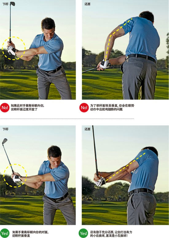 下杆,当左臂与地面平行时,确保手套商标朝向你的对面(见底端左图)。这能够使得杆面在触球前转至垂直或稍微闭合。