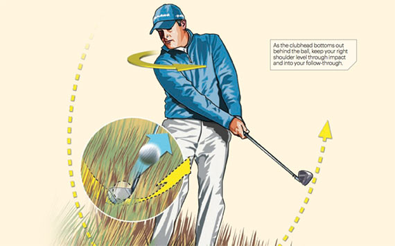在下杆时,想象挥杆弧线的底部在球位的后方,并从球位下方的草丛滑过。在击球过后的送杆过程中,直到手部位置达到腰间高度时,右肩应保持水平,然后再转向目标方向。这样可使杆头在击球时保持加速,直至收杆为止。