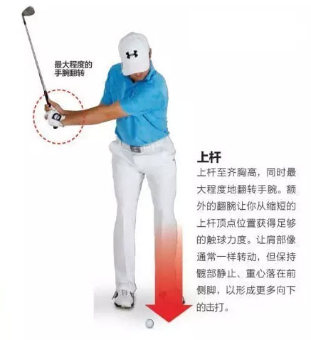 一些业余球友害怕打“棘手的”40到60码的半挥杆击球。你不会这样。照我的建议练习,让这些短距离击球变得像扔飞镖一样自然,并且更多地将它们打到轻推入洞的范围。面对这些打半挥挖起杆的距离,我喜欢采用打上果岭后跳一小下然后立刻停住的击球。请记住,相比长切击,这种击球更像是缩小的全挥杆击球。更多应用速度而不是手腕得到“ 一跳即停”击球所需的球旋,但球旋又不能太多,否则球落地后会向后更远地滚离洞杯。利用右边提到的这些技巧,使用不同的挖起杆练习看看每支球杆能打多远。