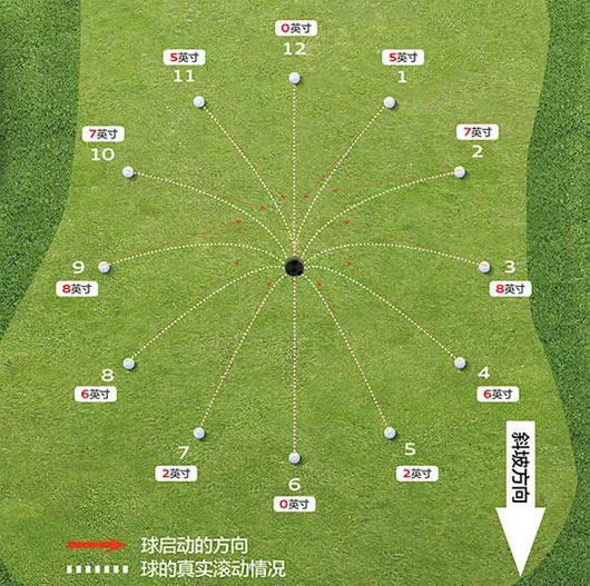 想象一下球洞就是一个巨大表盘的中心,在中点位置面对上坡你正前方是12点钟,此时能轻而易举地判断出推杆角度。上图详细列出了一记10英尺推杆在英国典型果岭(斯蒂姆果岭测速仪测速为9、坡度2%)上折点变化。