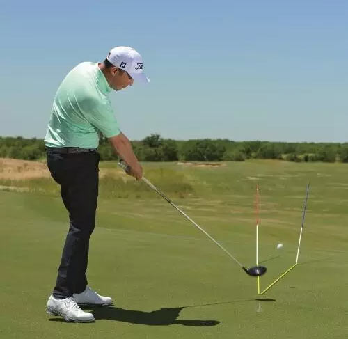 如果你平时的出球路线是由右至左,那在目标线右侧20度左右方向摆放另一支指示棒。如果你的出球路线是由左至右,则需要在左侧20度摆放第二支指示棒。在地上的指示棒末端用另外两支指示棒做成“球门立柱”(红色与蓝色指示棒)。