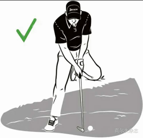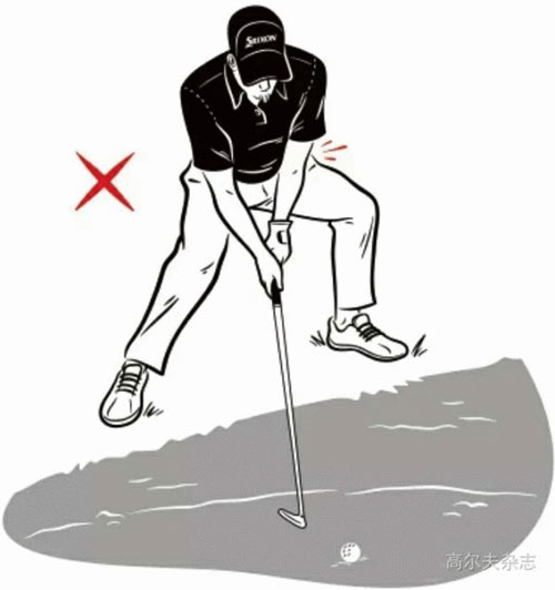 适用:球掉进边缘陡峭的沙坑。沙坑侧壁非常陡峭,你必须像相扑摔跤手那样蹲下才能使杆头靠近球,或者大幅向前屈体,冒着一头扎进障碍区的危险。