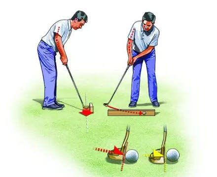 找一个平坦的可以练习推杆地方,设置一个2 X 4的推杆区域,你也可以沿着家里墙上的踢脚线推杆。在这个2 X 4的范围内放置一个高尔夫球,将球杆放在球后,杆头趾部刚好接触到板子。现在试着杆头笔直地上下杆,保持在2 X 4的推杆区域里。