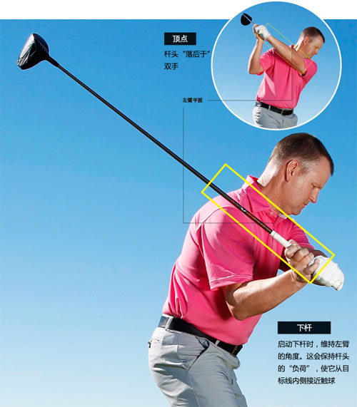 1.挥杆到达顶点时检视双手、双臂和杆头的位置。确保杆头在正确的地方,也就是我上面说到的“落后于”双手(右上插图)。