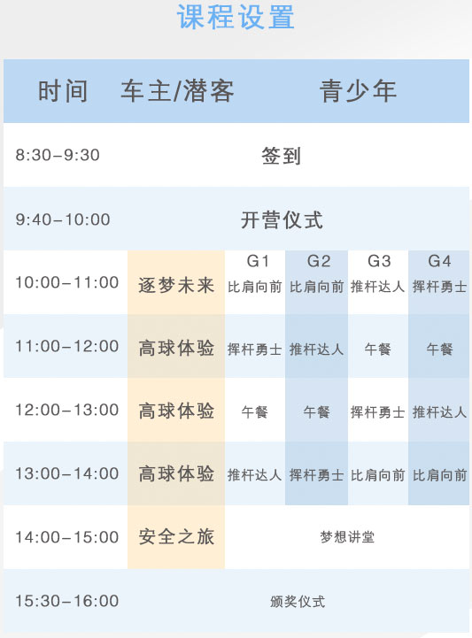 训练营开营时间: 广州站:2016年12月3日(周六) 参与对象:每站8-14周岁青少年及一位陪同家长 参与人数:80个家庭 孩子课程安排: 梦想讲堂、推杆达人、挥杆勇士及“比肩向前”团队竞技