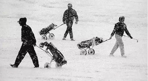 这时的果岭不像是推击区,倒像是月球表面。冰冻的果岭速度会变快,球在上面半是滚动半是滑动。不过这样的果岭也有好处,你可以不必考虑草纹,因为此时草已经停止生长了。设计推击时,只需着重考虑速度即可。