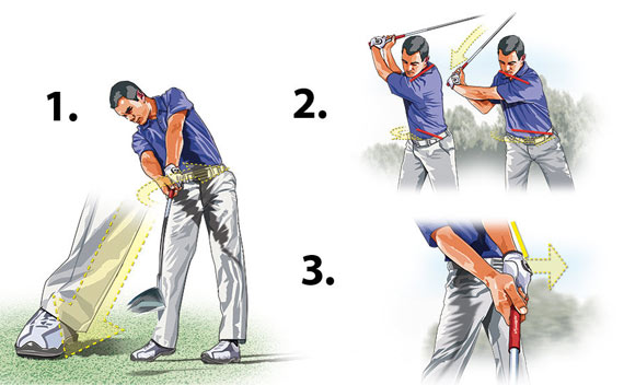 在开始下杆的同时,右脚内侧边缘要压向地面。这时产生的爆发力将下半身转向目标方向,产生惊人的挥杆速度。注意右脚跟不要向远离目标方向移动,这样会破坏根基的稳定性。