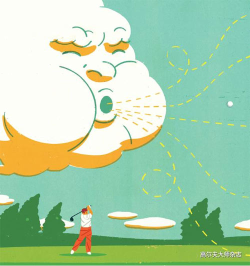 如果你正面对一阵由左至右的大风,把注意力放回到自己身体应该做的事情(方正杆面),而不是感觉上(祈祷奇迹的出现)。选择一个目标点,并移动它。开始时假装没有风,瞄向一个偏右的目标点,然后把这个点移至左侧更安全的地方并挥杆,想象那个方向没有任何麻烦。放松挥杆,你会感觉更好。即便不能让球飞向左侧,也会比总是打出大右曲感觉更好。——莫里斯·皮肯斯博士