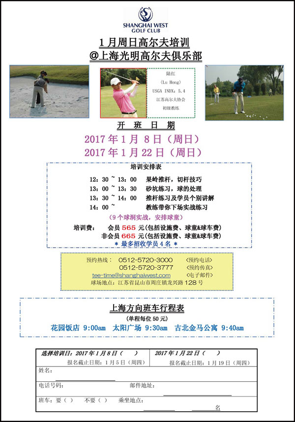 上海光明高尔夫俱乐部2017年1月周日培训安排