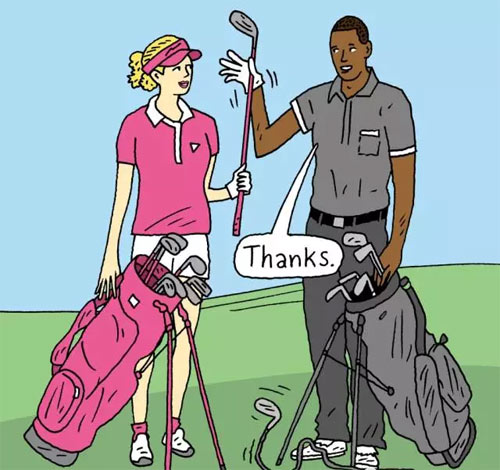 虽然现在高尔夫规则当中对球杆的规定有所放松,但在比赛中向其他球手借球杆使用仍然是违规的。但如果你只是想看看别人的新款球杆,可以这么说——“我也想买你这款球杆,介意给我看看吗?”当然,你也可以前去奉承一番,夸奖对方用该款球杆打球有多漂亮。这样,对方有可能将球杆递给你。注意在试挥时千万不能让杆头接触草地。