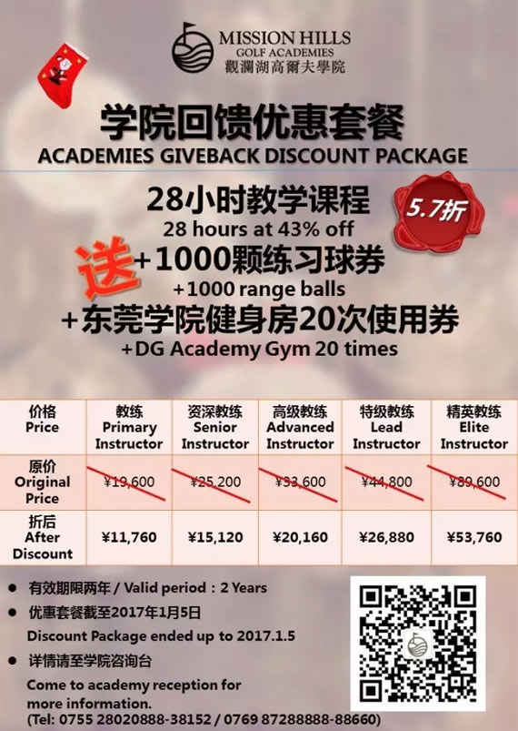 圣诞节、元旦节,双节怎么过?12月23日,观澜湖高尔夫学院圣诞四杆挑战赛&主题晚宴约定你。 高尔夫趣味挑战赛,晚宴大派对,唱诗班,乐队表演,圣诞老人现场礼物大派送!当然,除了礼物,还有年度最强套餐&回馈优惠套餐,连环大放送,动了么?
