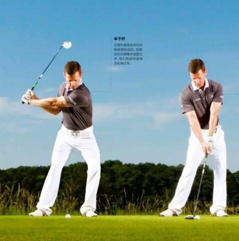 注意右脚向内侧微微转动。如果此时右脚离开地面过多,说明下杆时起身过早。