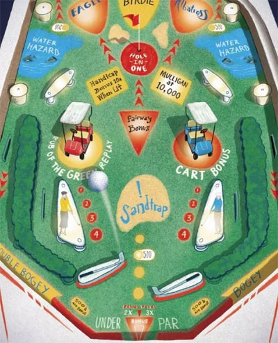 你的搭档简直是弹珠奇才,而不是旗杆猎手。对你们二人来说,幸运的是他进入球车的那一击是在比洞赛中。这里,根据规则19-3,你的搭档可以取消刚才那一杆重打而不必受罚,因为他的球首先击中的是对手的球车。(假如,那一击奇迹般地将小球送入了洞杯,你也可以忽略这个选择,根据规则19-2,只需被罚1杆,而不是2杆。)