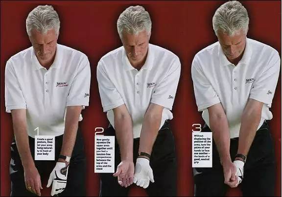 高尔夫挥杆是一系列动作的结合:身体转动,双手及胳膊反应。为了保证这一系列动作能平稳进行,初始阶段用双臂及肩膀创造出我所谓的“控制区”十分重要。通过伸展双臂,微微收紧手肘,你不仅能在胸前创造出长窄的三角形状,还能让手腕在挥杆过程中自由活动。