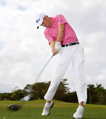 稳定的下半身同样能在下杆不失去平衡的前提下制造足够多的挥杆速度和力量。这种平衡能让你使用杆头甜点扎实触球,把制造的挥杆速度转化成击球距离。一次好的挥杆应该在上杆时让右脚内侧支撑,尤其是脚后跟处。