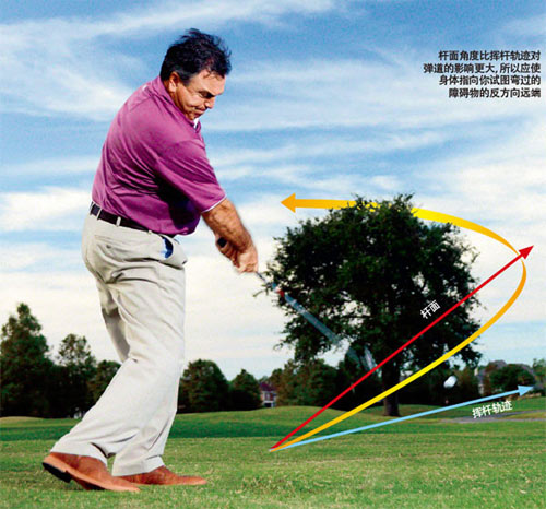 挥杆轨迹对弹道也有影响,但考虑到杆面朝向对弹道的影响,你必须在打左曲球时大幅度向外、向右挥杆,在打小右曲球时向左挥杆。打小左曲球时,应该想着击打球内侧后部;打小右曲球时,应该想着击打球外侧后部。这样更有可能打出想要的曲线球。