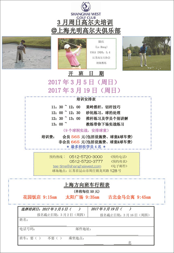 上海光明高尔夫俱乐部3月周日教程安排