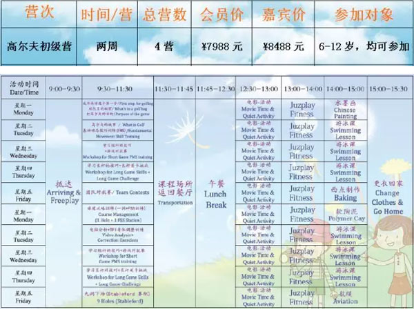 为期两周的课程由资深高尔夫教练全程授课,针对孩子们的年龄、基础等特点,制定出专业系统的高尔夫课程: