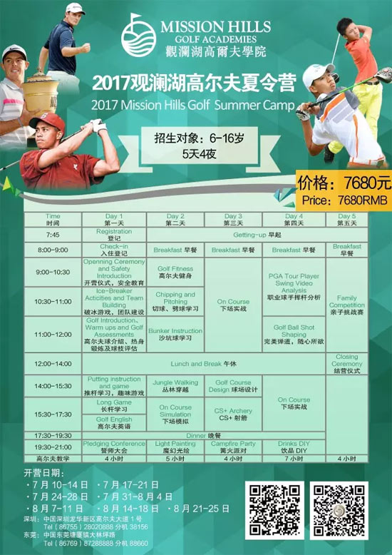 7680元/人 2017观澜湖高尔夫5天4夜夏令营