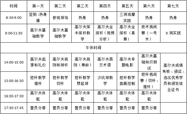 用一周的时间调节孩子的学习方式,培养高尔夫兴趣、提升高尔夫技能、学习了解高尔夫历史、文化,拓展国际视野,培养孩子坚韧独立、彬彬有礼、从容乐观,不要让您的宝贝错过这项优雅运动!