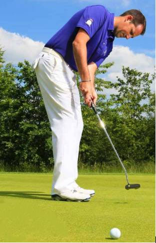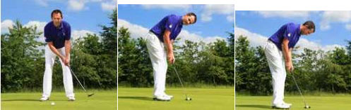 站在球后:注意观察推击线路,决定好准确的推击线。站在球与洞杯连线的延长线,双眼盯着洞杯做一次空挥。