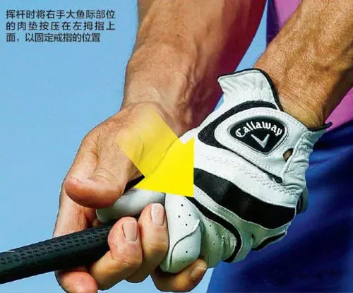为了在通过触球时保持杆头稳固,试试这种(新)握杆:将右手掌右下部的肉垫(即拇指下方的大鱼际)稳稳地压在左手拇指根部。确保肉垫没有覆在接近指甲的拇指关节上,而是在下一个接近手腕的关节上。挥杆时,倘若始终维持这个“压力点”,杆面就刚好在触球时回正,不会出现过度转动导致左曲球。要想切实感受这种压力,可以在两拇指间放一件贵重的东西——比如你的结婚戒指。因为你最不想看到的就是让戒指掉在地上,你会自动增加右拇指给左拇指的压力。只要保持住这个握杆压力,你就会找到完美的杆面转动——并看着球朝着球道中央呼啸而去。
