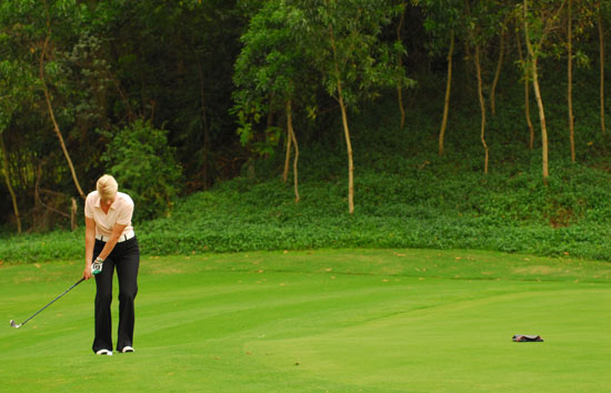我开始放慢心情,击球前先做几次试挥,每一次试挥,都放慢节奏,转身转足,上杆上到顶点,然后再启动回转下杆。
