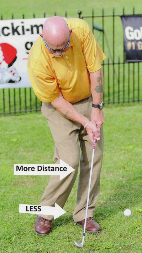 当杆头即将碰触到球的那一刻,只要向着目标方向弯曲膝盖就好。膝盖弯曲的程度决定球速和弹道。