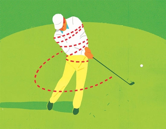 转动头部起来可减小紧张度,也可以使身体旋转得更到位,增大杆面中心击球的概率。此外,还可以使杆头运动弧线与地面的夹角更小,而不会出现陡峭的“锄地球”。