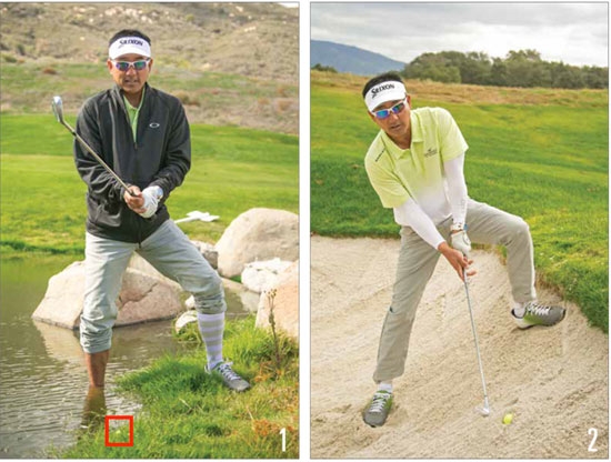 如果你的球不管有多大的部分露出水面,那都是可以打的。击球方法也很简单,根据小球有多大部分没入水中,然后就像打普通的沙坑球或者是陷进去的沙坑球一样(见图1和图2)。