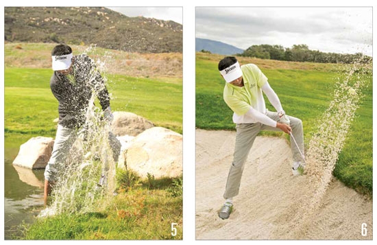 如果小球有一半或以上部分露出水面,你可以把它当成普通的沙坑球处理——除了杆面对准目标保持方正。如果小球有一半或以上部分都在水下,那就需要像打荷包蛋一样的击球了,需要陡峭的挥杆和进攻角度,还有简短的送杆(见图3和图4)。