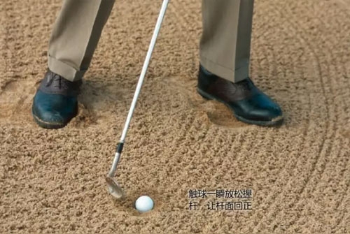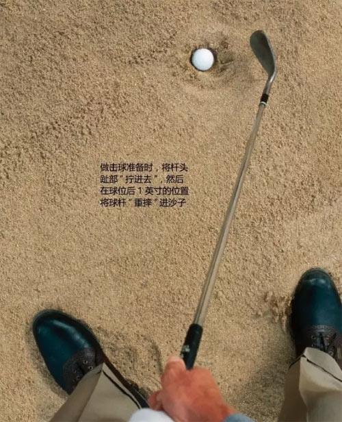 做击球准备时,通过转起杆头趾部将杆面盖上,同时双手与自己的胸部左侧平行,形成杆身一定的倾斜度。这使你下杆陡直进入球位后1英寸中的沙子中。