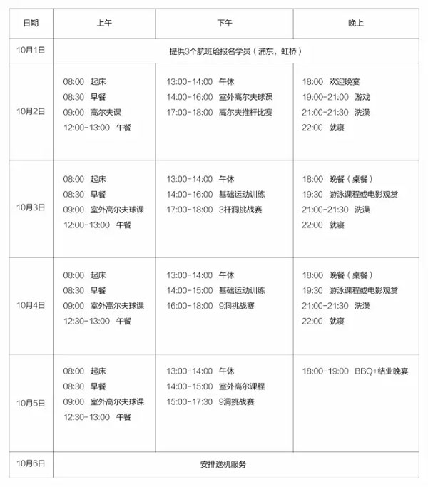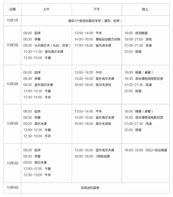 机场接机直接抵达球会酒店,每日生活导师督导,全程负责学员安全,合理安排训练时间;除了高尔夫,同时注重训练孩子独立自主的生活能力。