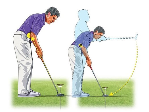 为了确保杆头方向的精准性,首先挺直站立,水平握杆,使推杆与前手臂保持在一条直线上。左右手肘都应该后收于体侧。接下来,从臀部以上位置开始前倾,慢慢降低推杆与地面的高度,在此同时弯曲膝盖,确保杆面与目标线保持方正。