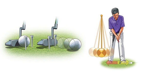 想象一下摆钟来回摆动的情形,并且注意两侧摆动的幅度应该保持一致。这与推杆摆动是完全一样的。杆头应该在碰触到球之前的那一刻达到最大速度,而不是在击球过后达到最大速度,许多球手企图在杆头击球时做加速运动,殊不知,这会导致不良的球路,并在距离控制上出现失误。