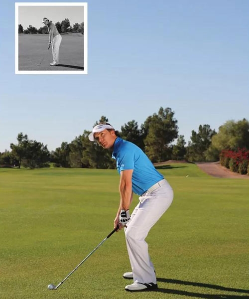 正确:球处于站位中间,杆身略微前倾,这会形成更好的击球效果。记住,挥杆弧到达最低点的位置就是恤衫纽扣正对的地方;只要前胸稍超前于球位,就没有必要让球位靠后。随着杆身略微向目标前倾,你会保留一些杆头底部的反弹角,让杆头顺利滑过草皮,而不会下挖!