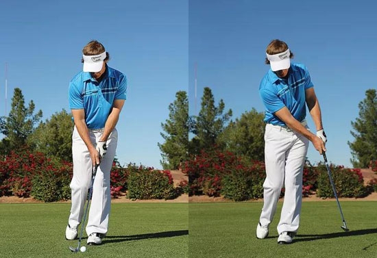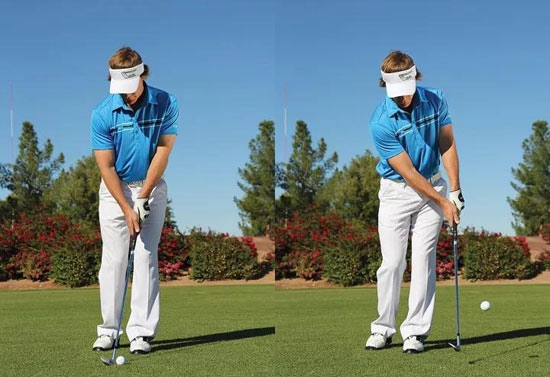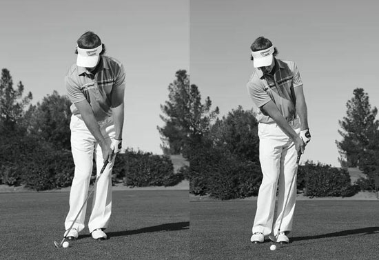错误:与高弹道击球相反的是低飞多滚动的切击球。此时你的站姿更高,站位变窄,双脚之间的距离约为一个杆头的宽度。虽然经常被教导:让球位靠后,杆身显著前倾,但这可能会带来灾难性的后果。因为这种预备姿势会造成太多的下挖,使杆头前缘插进地面。这是个极大的错误。