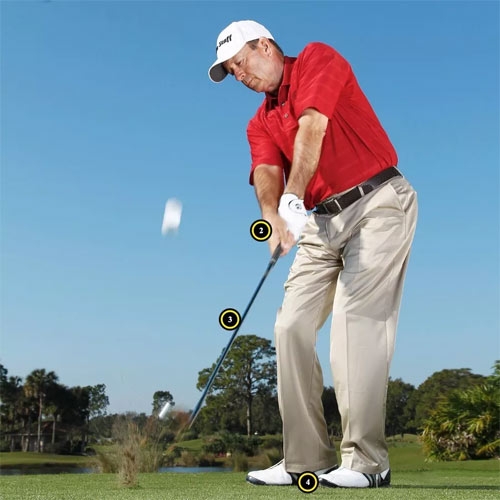 5码击球和75码击球的唯一不同就是上杆幅度。显然,挥杆幅度越大,击球距离越远。争取使杆头保持在双手外侧,做出更接近垂直的挥杆,使杆面保持垂直,甚至稍微开放。