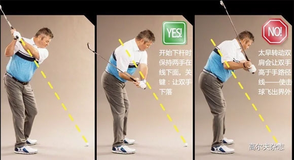 下杆时如果双手在手路径线之上,你就麻烦了。通常,这发生在当你依靠转动双肩或者让身体留在右侧来启动下杆时。结果包括打出左飞、左曲、打厚击球和剃头球。除此之外,一切正常。