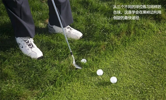 当然,你永远不可能在挖起击时架球座,但那不是关键。这个练习要教会你的就是球位对球旋会产生怎样的影响,而控制球旋就是短杆击球送至洞口边的诀窍。这是非常宝贵的一课。用不同的挖起杆,从不同距离击球。经验会让你立刻变成熟练的老手。