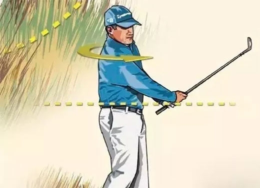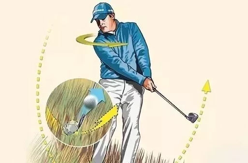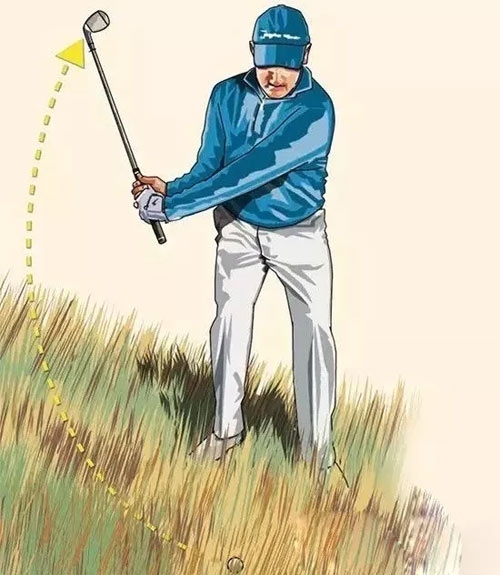 上杆的同时要做屈腕的动作,形成陡峭、垂直的挥杆平面。触球角度更陡,可以增加小球击出去的高度,也可以减少杆头在长草中的时间,从而减少击球瞬间草叶缠绕杆头,保证杆头迅速通过。