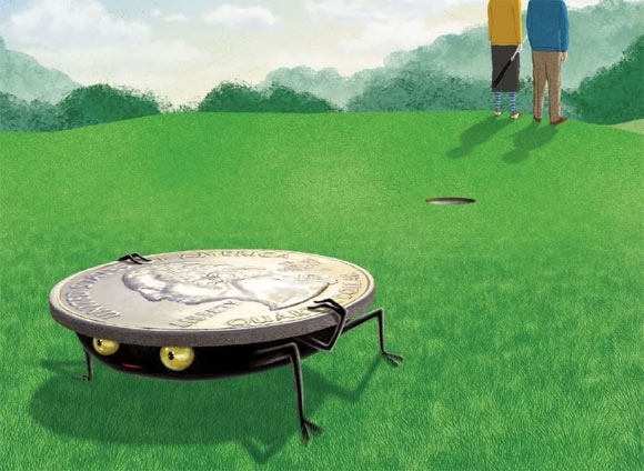 先生们,用羽毛或活的昆虫标记球的危险,现在应该很明显了(尽管,如果球标是从6英尺处挪到2英尺处会觉得更可疑)。无论怎样,在这种情况下,你确实要将球放回原位,不罚杆,尽可能接近球原来停止的位置——建议你的朋友之后用那种可以按在地面上的球标。