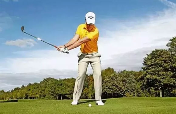 双臂延展、无多余动作表明起杆时我并没有操纵球杆;右肘关节位于身体前方,并没有弯折向身后运动。下半身基本上没有运动。