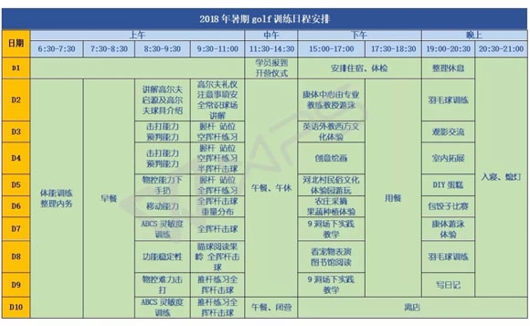 备注:高尔夫夏令营每期为十天、每期招生名额为12个学员,10人开营。