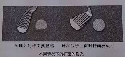 采取开放的站姿,打开15度左右,双脚埋入沙中保持稳固。上杆时迅速屈腕动作要快,即上杆比较陡峭,下杆时杆头快速切入沙中。如果球陷入得比较深(如荷包蛋),杆面要关闭;如果没有陷入沙中,杆面要打开,要有割击沙子的感觉。