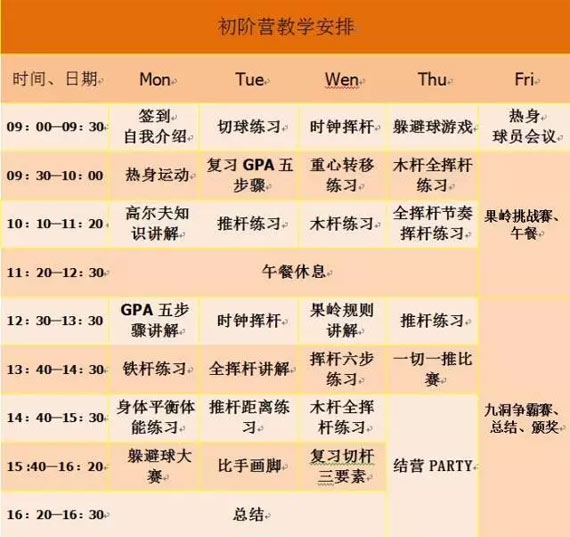 瞄球及身体的角度、挥杆的基本常识与原理、身体的稳定性、挥杆平面的控制、整体动作的调整与挥杆六步骤的练习等。