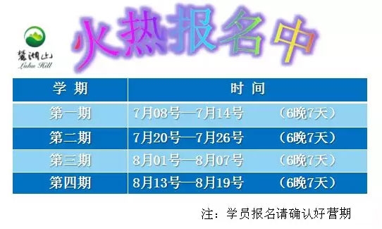 报名方式:学员需填写报名表格一份,家长及学员需在麓湖山夏令营规章制度上签名,提交学员身份证复印件一张、1-2寸照片两张。