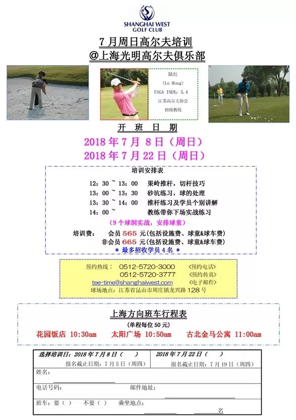 上海光明高尔夫俱乐部7月周日培训教学安排