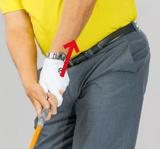 再试挥一次。你或许会过度弥补之前的挑杆动作,触球后让握把外张。虽然你正确地保持双手远离身体,但向外朝目标右侧移动双手会使杆面大幅开放。